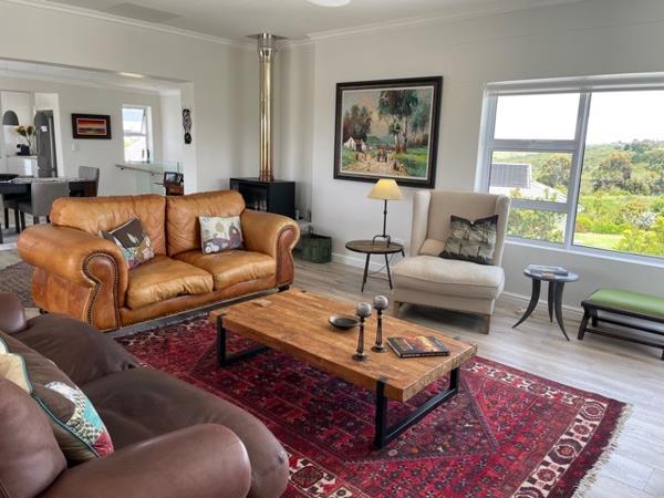LOUNGE: Well-furnished lounge with large leather sofas, large flat screen smart TV with full DSTV and Netflix, fireplace, doors lead out onto a sunny covered entertainment patio with lovely views.