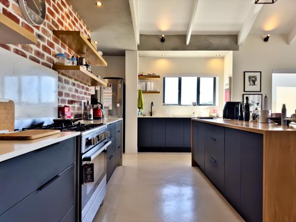 Large island, lots of cupboards and drawers, beautiful open oak shelving, large gas hob with under counter oven, washing/prep area.