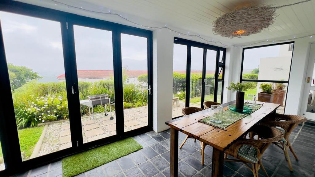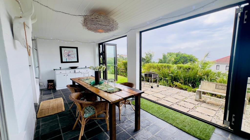 Lovely spacious enclosed patio with table and chairs for dining, doors open to the garden where there is a braai area.
