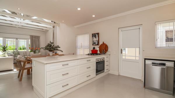 As you enter the white rose-lined front gate there is a sense of calm and peace. Through the sandblasted, front door, the home flows into a charming entrance hall through to the light-filled, open plan living area. The kitchen, to the right, has a centre island and is kitted out with all necessary amenities. The elegant dining room has a 6-seater wooden dining table and chairs. The lounge has double volume ceilings and is furnished with comfortable couches, round nesting coffee tables, and a wood-burning fireplace for chilly nights in.