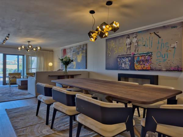 Luxury, spacious dining area with large table and chairs to seat 8 people, dining server, gas fireplace, wine cooler,