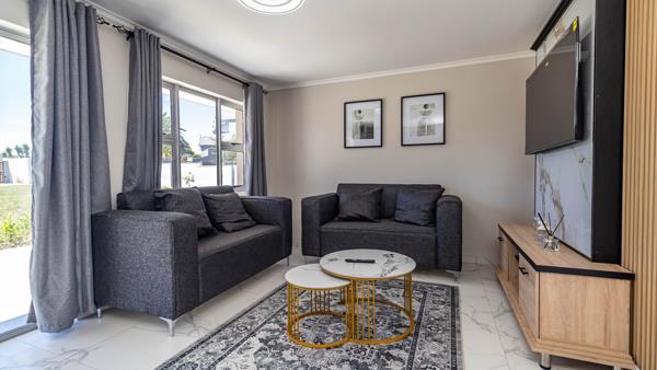 A lounge with l-shaped couch, smart Tv and marble nesting coffee tables