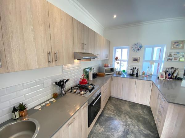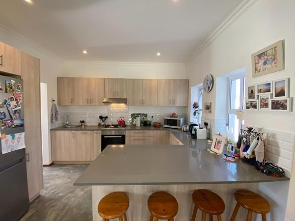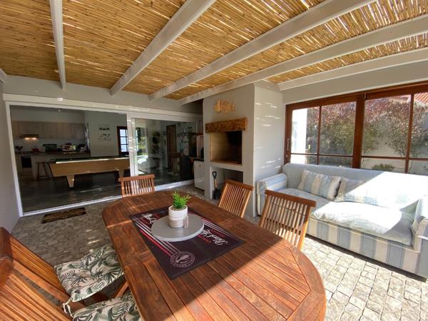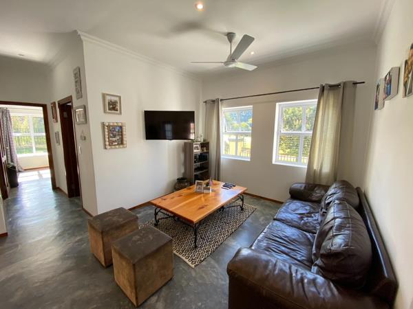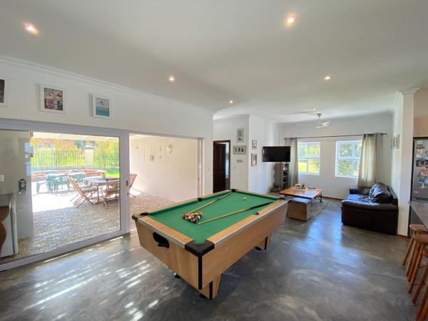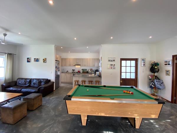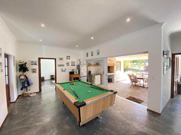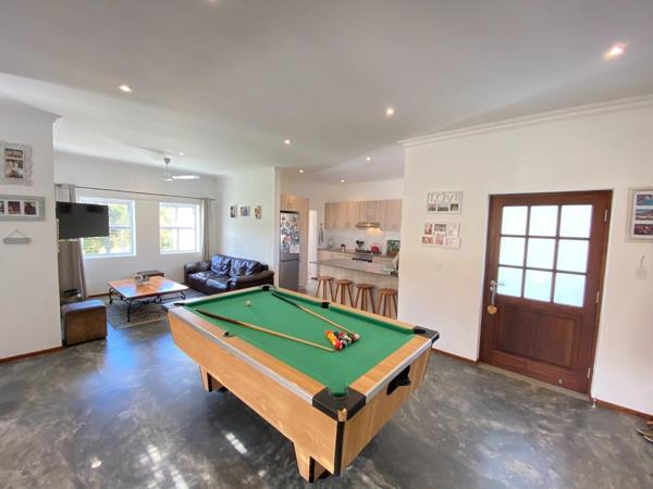 Enter from the Front Door into the relaxed open-plan Living area with TV Lounge (with ceiling fan) , Pool Table indoor Kitchen ledge Table seating 4 and Kitchen with Scullery. Doors open out to the covered Patio with Braai, Bar Fridge and outdoor wooden Table seating 6.