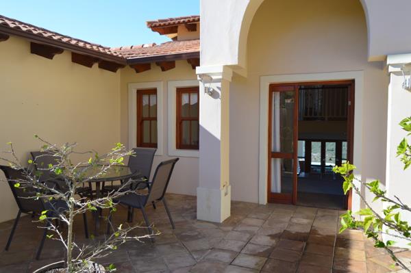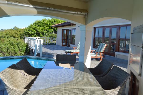 Doors lead out onto the decked Pool and Patio. Part of the Patio is covered and has a built-in Braai, a Weber Braai and outdoor Patio Table and Chairs along with two Sun-Loungers.