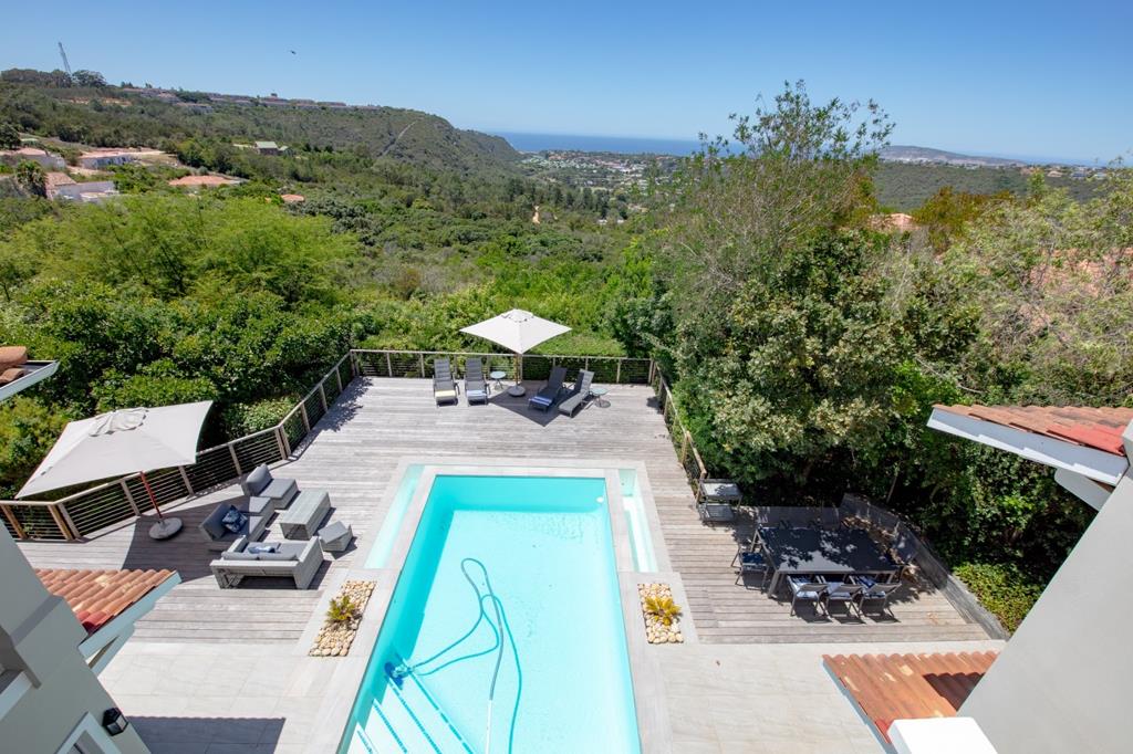 A large deck with swimming pool invites you to unwind, overlooking the lush garden, and great views, (there is no net on the pool)