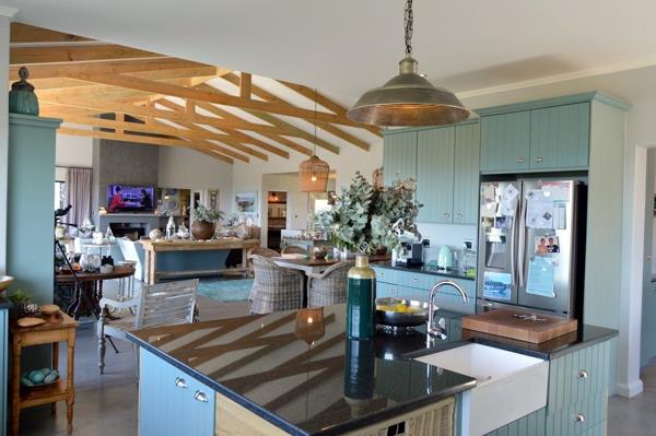 The main living and entertainment area has a modern, well-equipped kitchen to the left, with a kitchen ledge seating 4 which has a sliding window offering views over the bay.