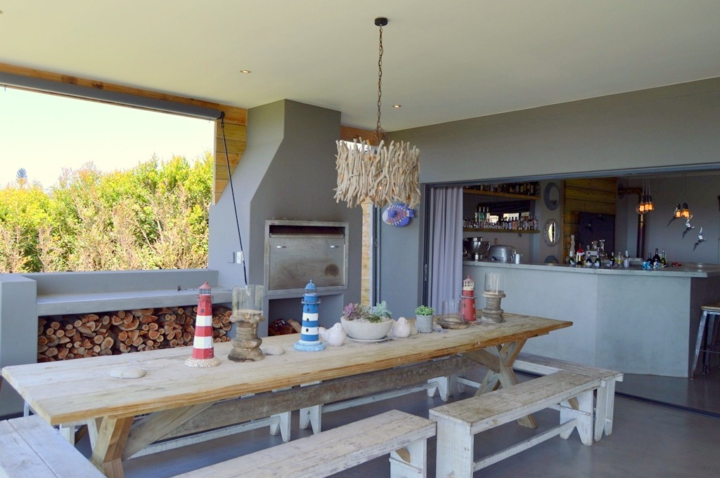 Indoor dining table seating 10 and large flat-screen TV in the living area. Sea-facing balcony with frameless glass balustrade. From the TV area, this leads to the entertainment area, fully equipped bar seating 6, large flat-screen TV to watch the game and cosy L-shaped sofa to fit the whole family and friends. Large stacking doors lead out to the covered patio with built-in braai, weber, outdoor dining table s eating up to 14 guests.