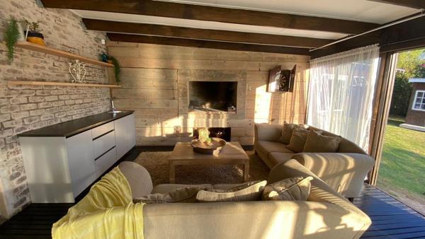Spacious sunny enclosed games and entertainment room with a built-in braai, dining table and chairs, ping pong table.