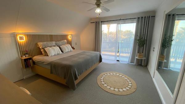 1 x Master bedroom with a King size bed, en-suite bath, toilet, and basin. Doors from the master bedroom open onto a sun deck with lovely views