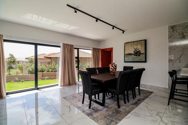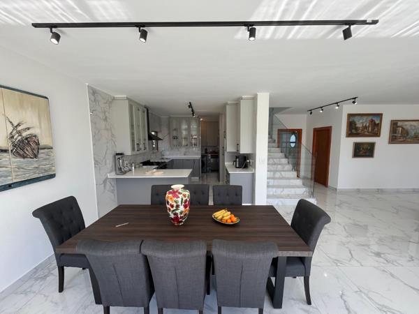 Doors lead to the covered patio with outdoor table seating with views overlooking the pool and garden area. There is a guest bathroom on the ground level and five bedrooms upstairs including the master suite bedroom. The Patio with prep area and built-in braai and pool area enjoy a grassy garden area for free play.