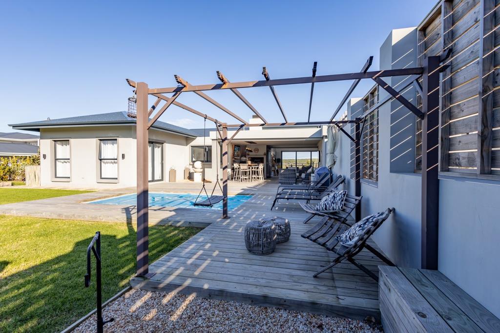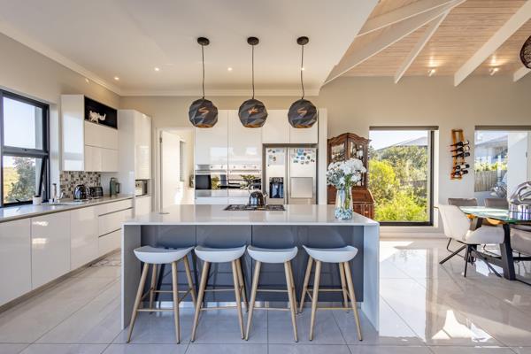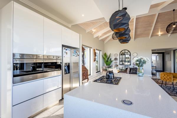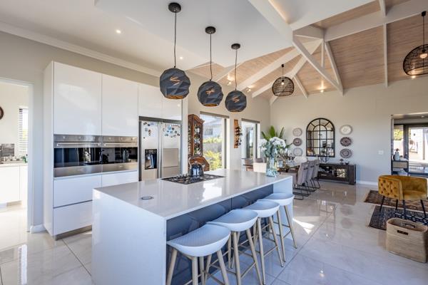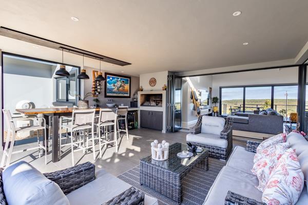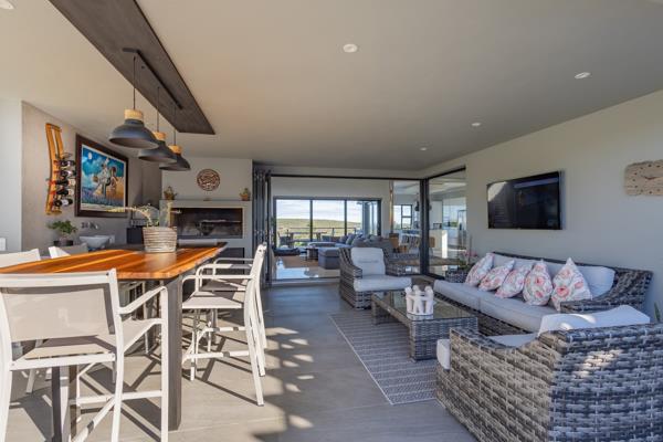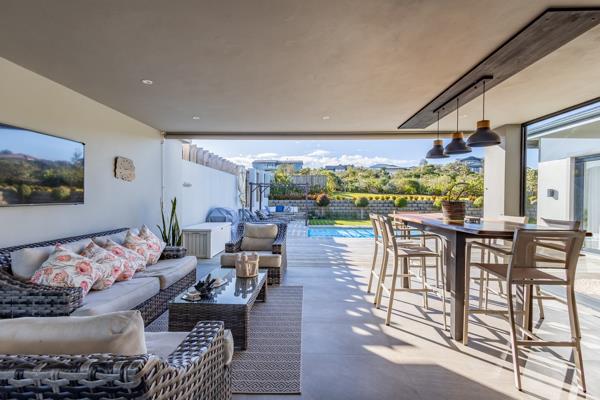 Enter into the open-plan living area with modern kitchen, indoor dining seating 10, expansive entrance area and sitting room with TV and fireplace. Doors lead onto the covered entertainment area with braai, outdoor furniture leading onto the enclosed garden and pool area.