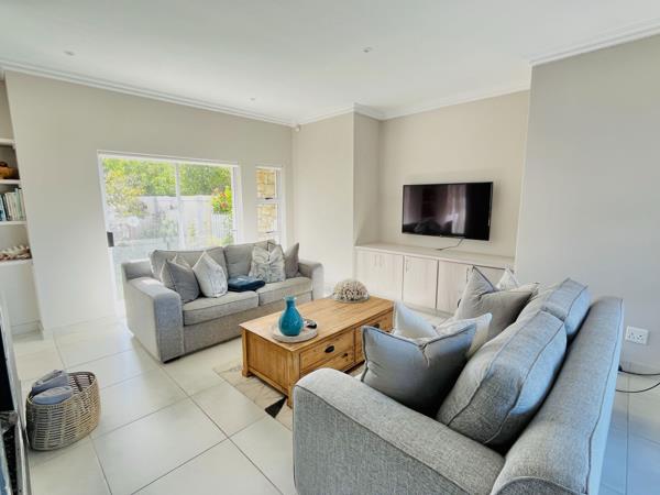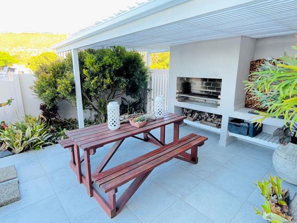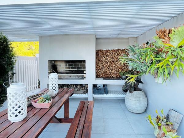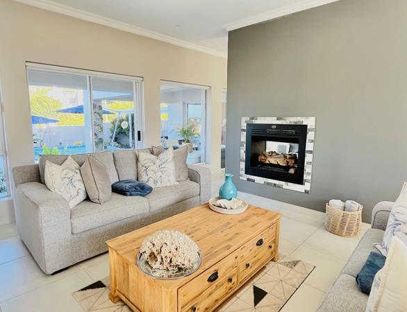 Step into the open-plan living area with a well-equipped kitchen, TV lounge, and an indoor dining table that seats 10. A separate, expansive entertainment lounge with a gas fireplace between the 2, a large flat-screen TV, air-conditioning, and direct access to the covered patio, garden, and pool area. The outdoor space is under cover and includes a built-in braai (wood) and a firepitperfect for entertaining.
