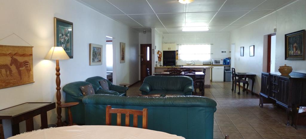 Step into a bright, open-plan space designed for family life and entertaining. The living area includes a cozy TV lounge, a dining area with a built-in braai, and a welcoming seating area ideal for gatherings and quality time.