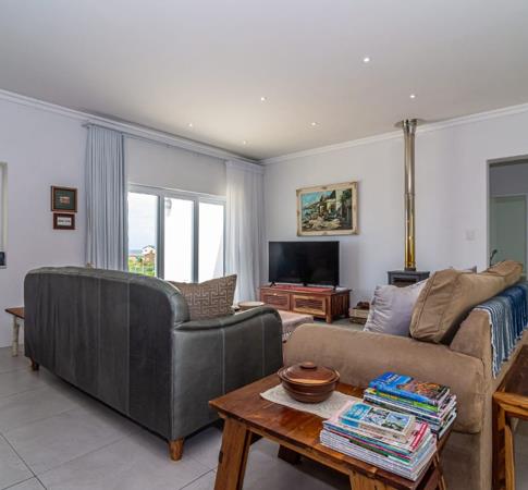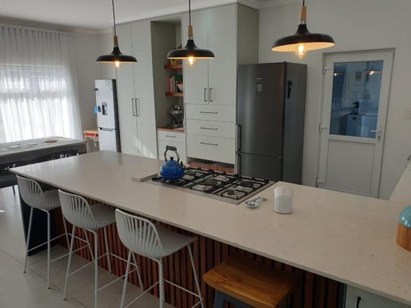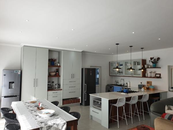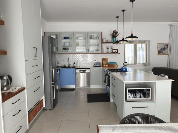The spacious layout features a stylish open-plan kitchen with modern fittings, a dining area, and a comfortable lounge that opens onto a covered patio with a built-in braai and sea views. Two of the three bedrooms are en suite, complemented by a third guest bathroom for added convenience.