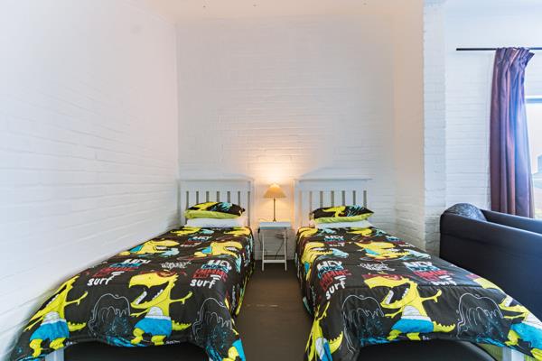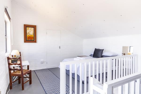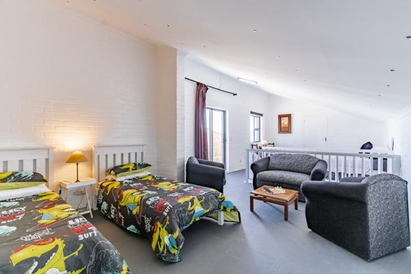 Upstairs youll find a large shared bedroom with two single beds and one double bed, perfect for guests or children. This level also includes a lounge area and opens onto a private balcony where you can enjoy views over Pringle Bay.