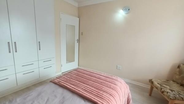 This stylishly designed Ground Floor apartment offers a generously sized bedroom with built-in cupboards, providing ample storage space. The unit features a modern, full bathroom with tiled flooring, while the rest of the apartment is finished with elegant laminated floors.