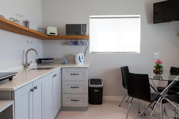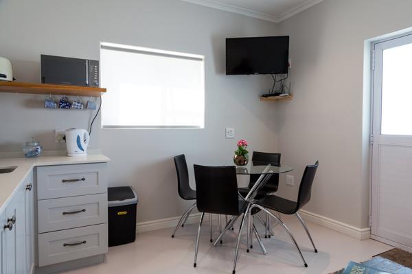 The studio itself is a dream come true, situated in a central location within walking distance of the Onrus Trading Post and Onrus Beach. It has all the essentials, so all you need to bring are your suitcases and braai wood. The studio features a communal braai area with a portable braai, and you can relax indoors with amenities like Fiber and a SmartTV so you can sign into your own streaming accounts. The kitchenette includes a little gas stove, microwave, hot plate, hot air fryer, and fridge.