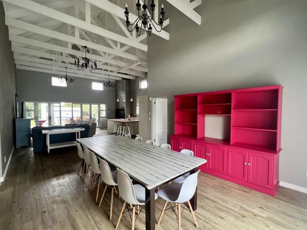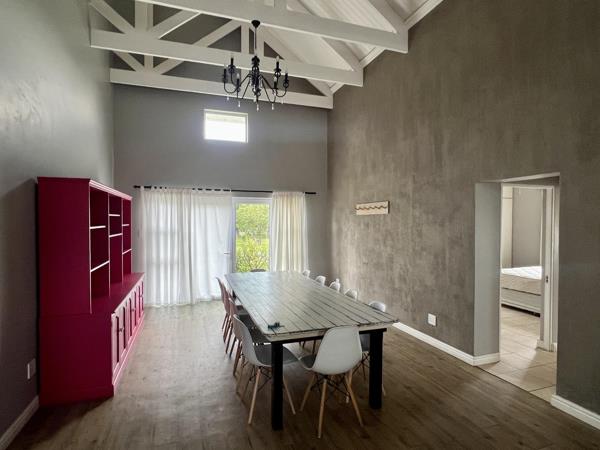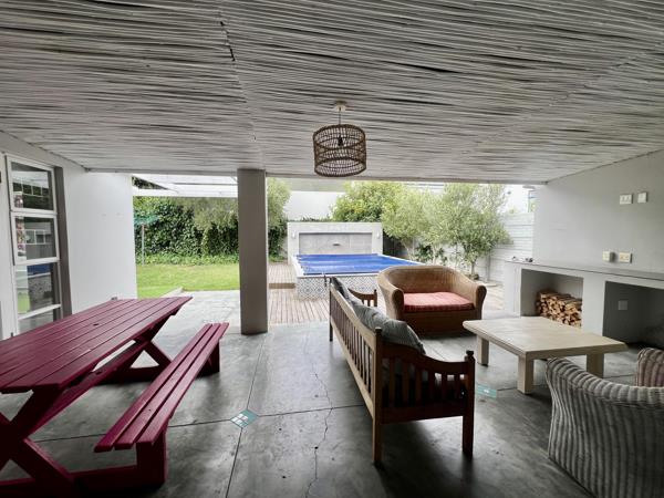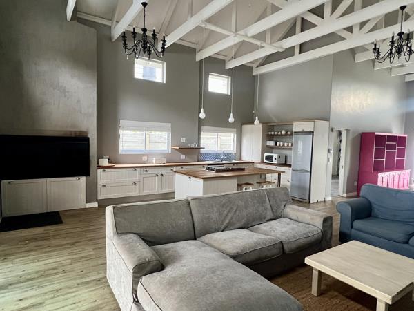 This house offers a lovely, large open-plan living area and kitchen with an indoor braai. It has 4 bedrooms, 3 en suite and a guest toilet. The outside stoep leading out to the swimming pool is covered and private and ideal for entertaining friends and guests. Teh house has a single garage and more parking available outside, with complete security beams inside and out.