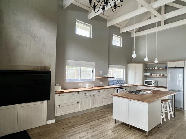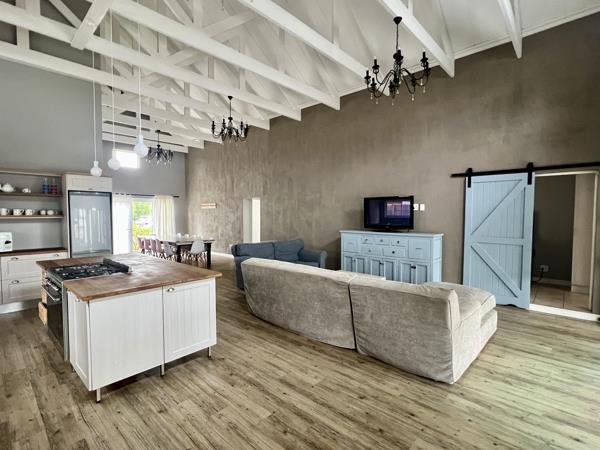 This house offers a lovely, large open-plan living area and kitchen with an indoor braai. It has 4 bedrooms, 3 en suite and a guest toilet. The outside stoep leading out to the swimming pool is covered and private and ideal for entertaining friends and guests. The house has a single garage and more parking available outside, with complete security beams inside and out.