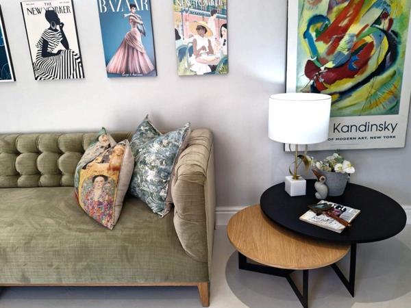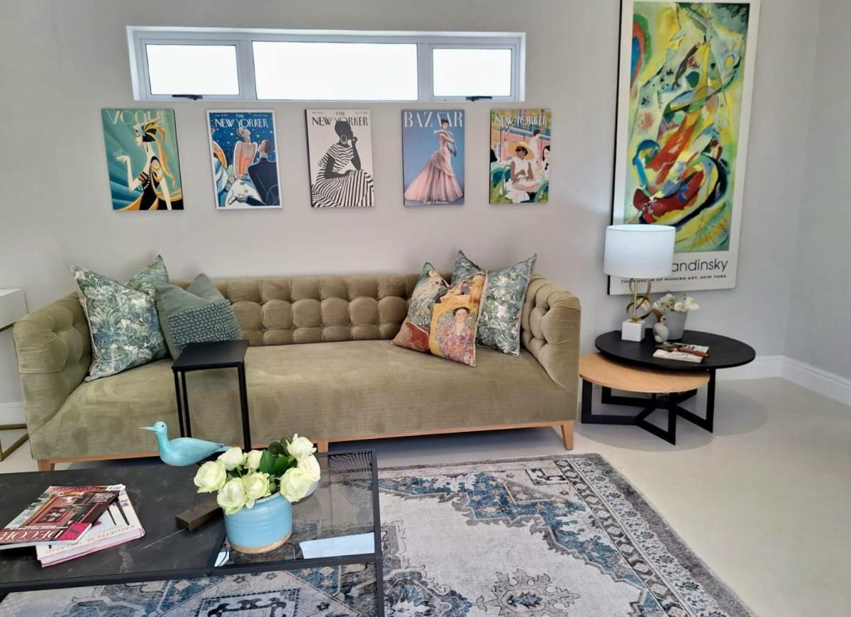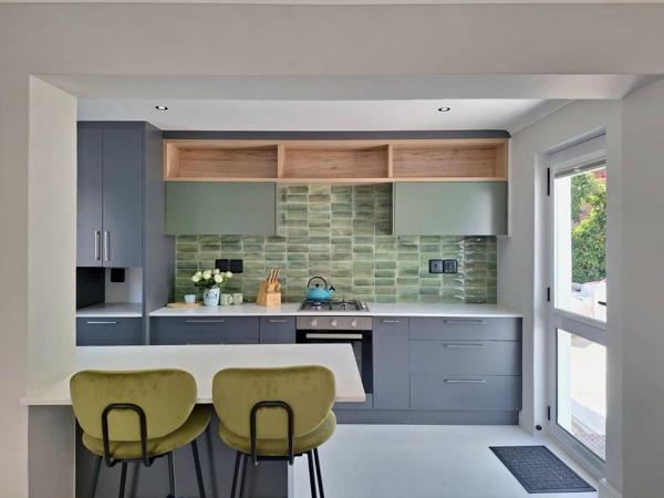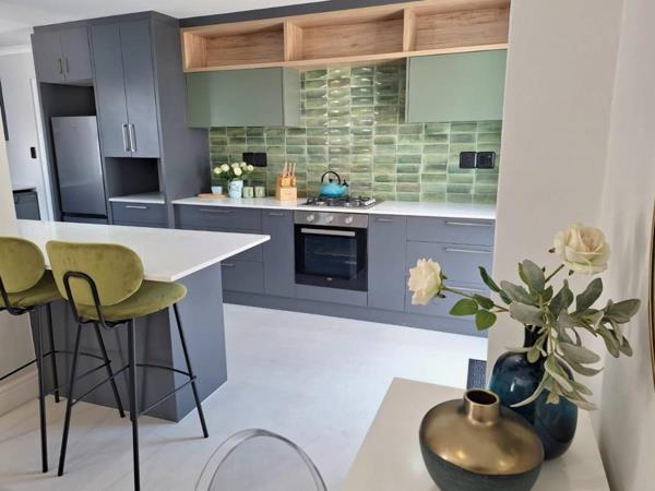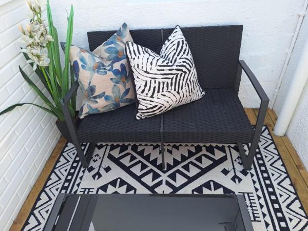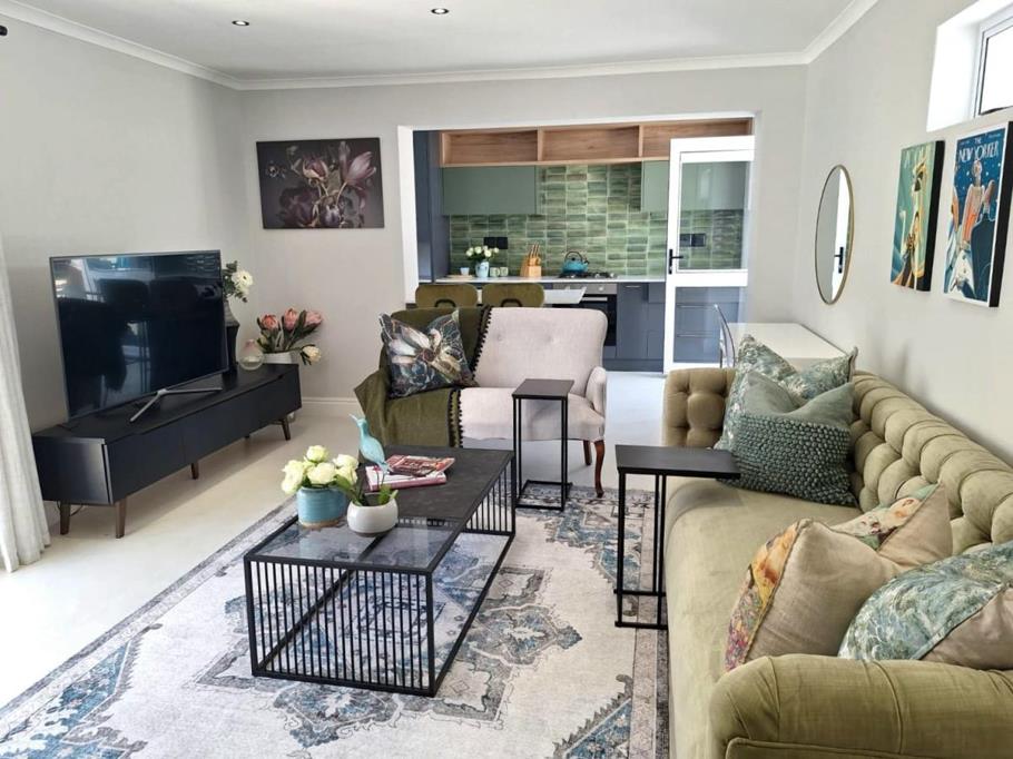 A designer-curated one-bedroom apartment, featuring a queen sized bed, perfect for a discerning getaway. The apartment is fully furnished with an open-plan living area that flows into a sleek kitchen and laundry facilities, plus a private outside braai spot. The bathroom features a modern shower.