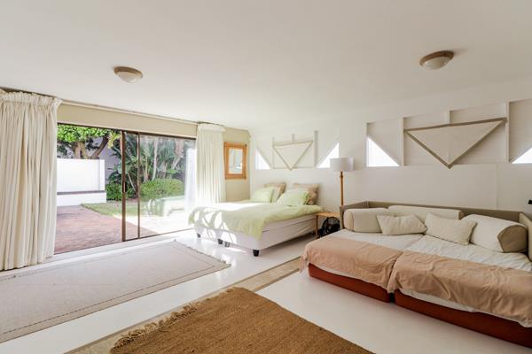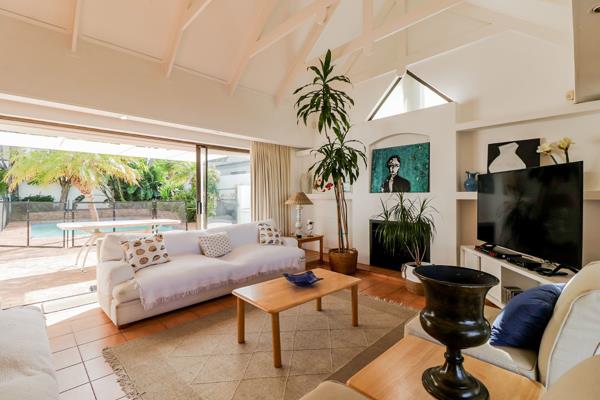 Leading off all the downstairs bedrooms is the open plan galley kitchen, dining area and open plan lounge with fireplace and smart TV. Glass sliding doors lead to the front and back gardens, the pool and built in braai.