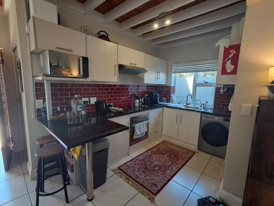 The kitchen is stylish with high-gloss red subway tiles and sleek black granite countertops. It has a built-in electric stove and ample built-in cupboard space. There is a space for a dishwasher and fittings in the garage for a washing machine.