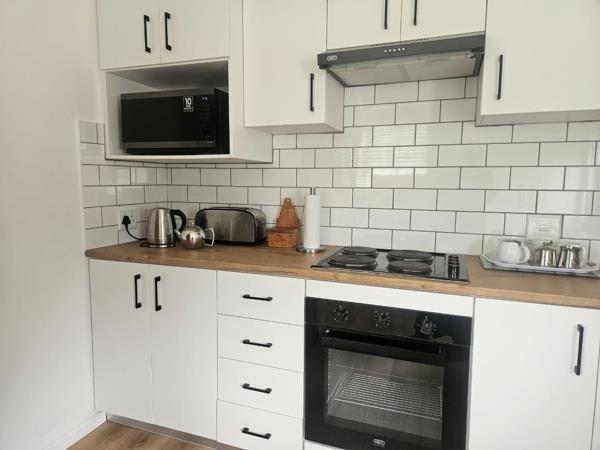 A spacious kitchen with ample cupboards and a built in oven and plates are included in the rental.