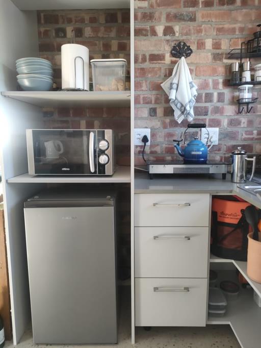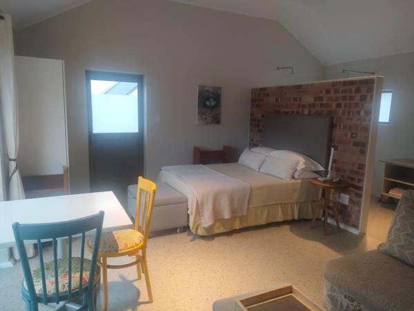 This furnished open-plan bachelor apartment offers comfortable and convenient living with beautiful mountain views. The layout includes a combined living, dining, and sleeping area with a double bed and a well-equipped kitchenette.