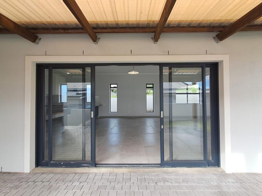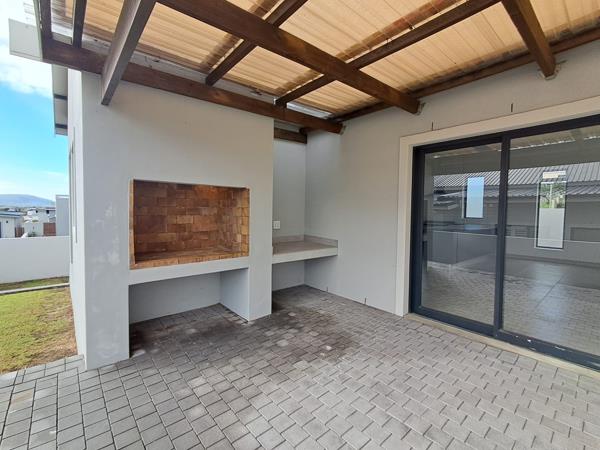 A large open-plan lounge, dining area, and kitchen leading to a covered patio with a built-in braai ideal for indoor-outdoor living and entertaining.