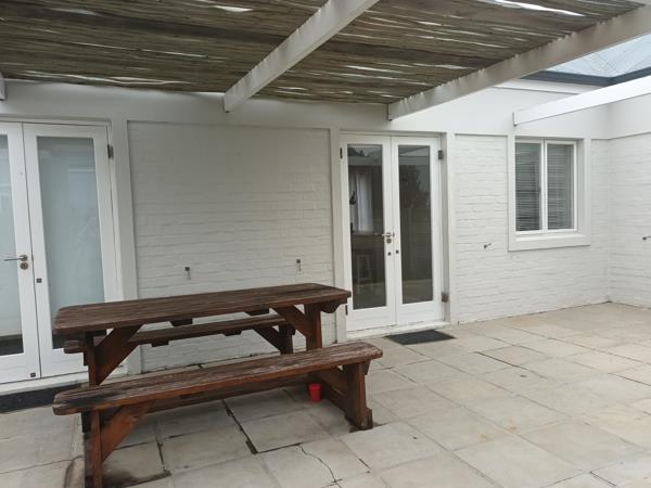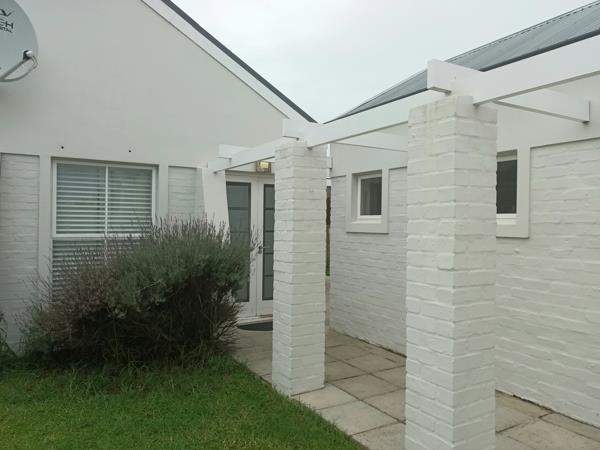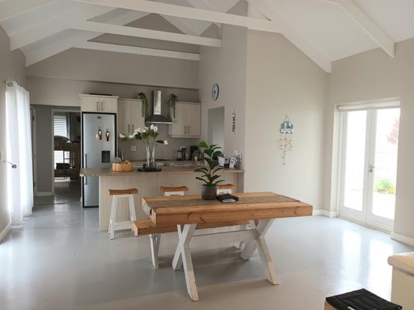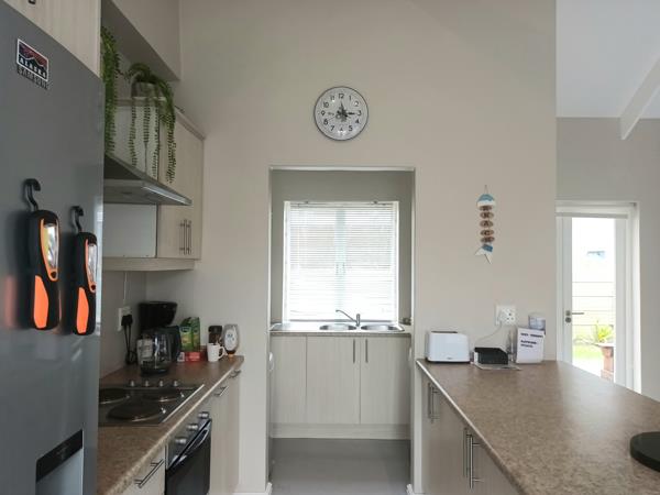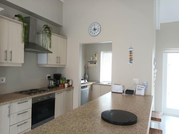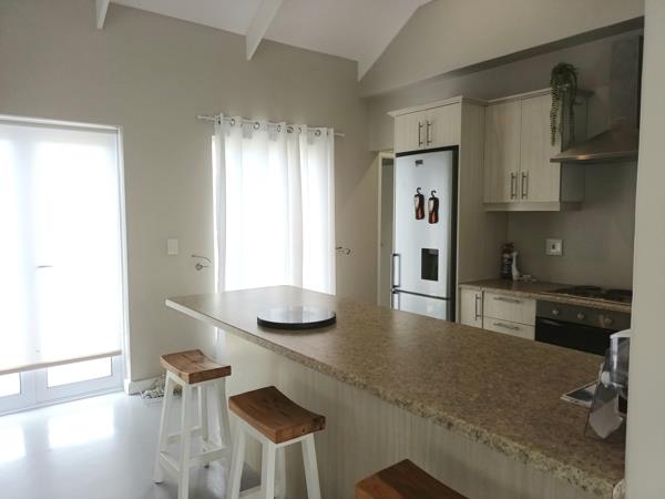 The home features a well-appointed kitchen with a separate scullery, three bedrooms with built-in cupboards, and two bathrooms. The large living area opens to the outdoor space, creating a bright and welcoming atmosphere throughout.
