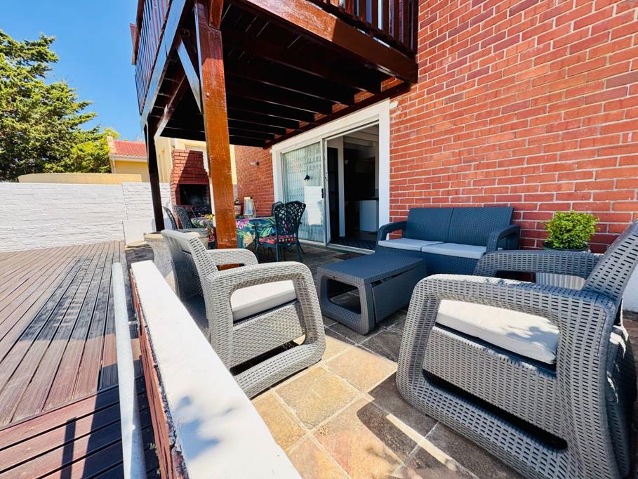 The living area is open plan and offers comfortable couches, TV and dining room set plus a fully equipped kitchen with gas stove. Sliding doors open up to the wooden deck featuring a patio set, built-in braai and views of the ocean.