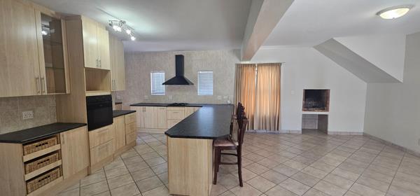 The spacious lounge area, perfect for relaxation and entertaining, includes a built-in braai. Large sliding glass doors provide abundant natural light and lead directly to a private, well-maintained garden and tiled patio, offering excellent indoor-outdoor flow.