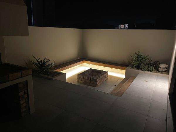 Outdoor entertaining offers a fire pit with wooden seating and an outdoor braai.