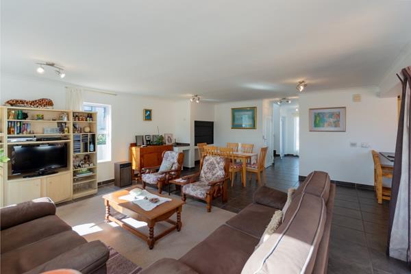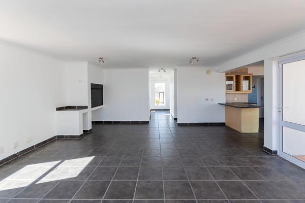 The open-plan living area incorporates the lounge, dining room, and kitchen. The lounge and dining area feature an indoor built-in braai and open via wide stack-away doors to a private, fully paved courtyard with an outdoor braai perfect for entertaining or relaxed outdoor living.