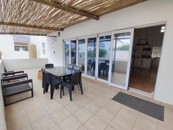 Step outside and let the fresh sea breeze rejuvenate your spirit. The expansive open-plan living area seamlessly transitions to a covered patio through large stacker doors, creating an ideal space for al fresco dining or evening gatherings. The inside braai ensures that your grilling adventures can continue, regardless of the weather.