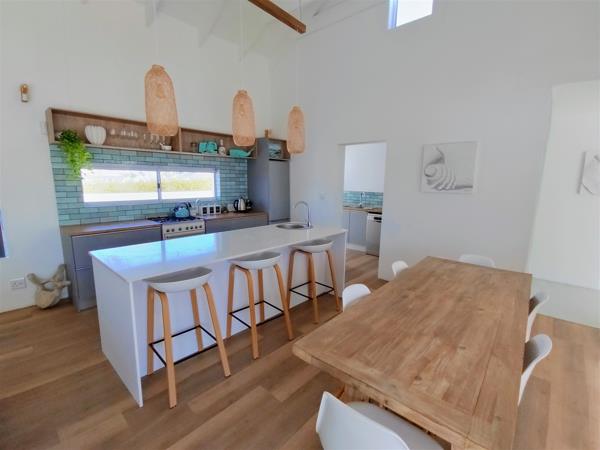 Additionally, there is another TV room with reading books upstairs. Outside the home, there is a spacious patio with an outdoor dining table and a built-in braai. The upper level also opens up onto a balcony which overlooks the estate and the ocean. The location of this property is within close proximity of a sandy beach, a golf estate and a spa.