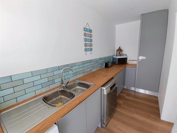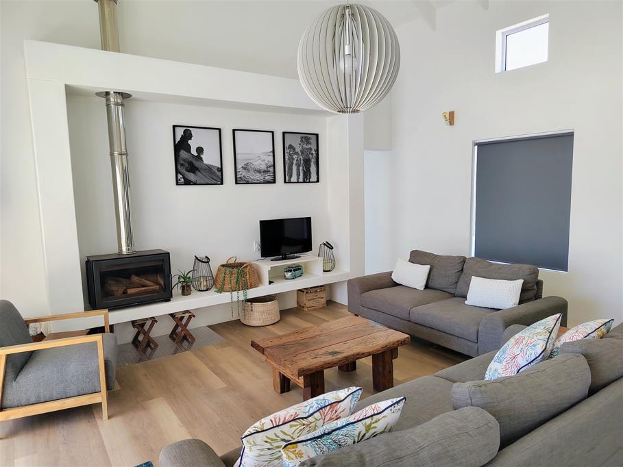 The open-plan living area features a contemporary design with a kitchen fully equipped with a gas stove, electric oven, microwave, fridge-freezer, cutlery and crockery as well as a breakfast bar with stools. A washing machine and a dishwasher are available in the separate scullery. Leading from the kitchen is a 6-seater dining table and a cosy lounge with comfy seating, a fireplace and a TV. Access to free Wi-Fi is available.