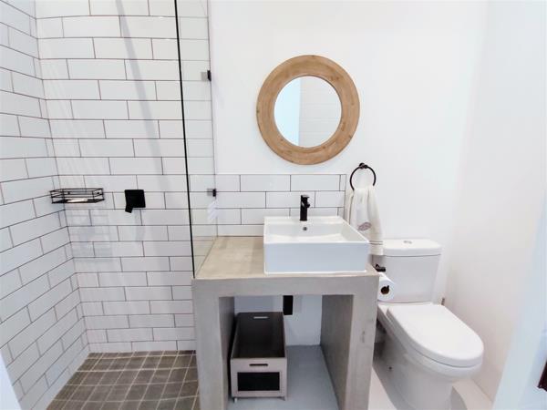 This double-storey property can accommodate a total of 9 guests at a time and comprises 3 bedrooms and 3 bathrooms. The main bedroom is furnished with a double bed and features an en-suite bathroom fitted with a shower. The second bedroom contains a double- and a single bed, while the third bedroom has a double bed as well as a bunk bed. This third bedroom includes an en-suite bathroom fitted with a shower. Another shower is available in the third bathroom.