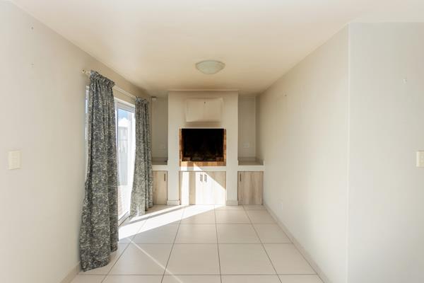 The ground floor features a well-equipped kitchen with a scullery, an open-plan lounge, and an indoor braai area. A sliding door opens to a cozy courtyard.