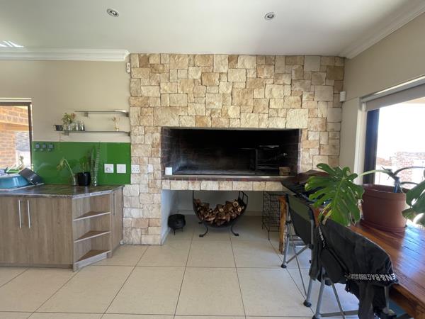 The ground floor features a spacious, open-plan design. A large living area and modern kitchen connect directly to an indoor braai. Stacking glass doors open entirely to a large wraparound garden with a custom-built pergola, creating an excellent space for weekend lunches and relaxed indoor-outdoor living.